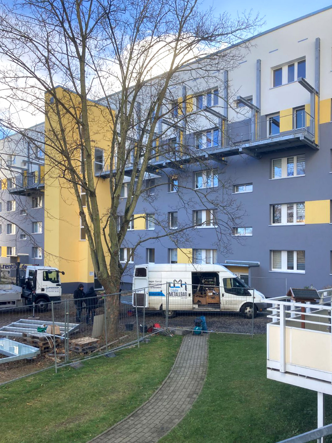 Anbau von Aufzügen und Strangsanierung mit Schaffung barrierearmer Wohnungen